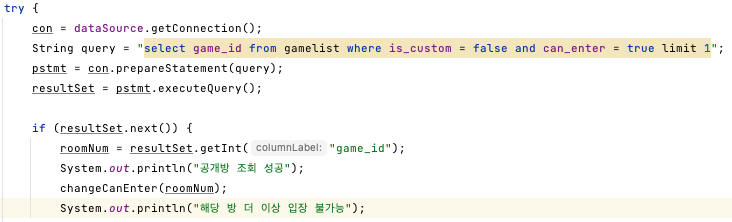 게임 횟수 DB 저장user가 둘 다 입장했을 경우만 DB에 저장되어야 하기 때문에 아래 단계를 진행하도록 로직을 생각해 보았다.1. 현재 로직에서 둘 다 입장하는 것을 판별하는 로직을 찾기2. DB에서의 게임 횟수(user_game_cnt)를 가져오기3. 가져온 횟수에 1을 더해서 update하기4. 1~3이 실행되는 시점은 게임에 입장하고 방에 2명이 다 채워지면 실행되도록 함1. 방이 2명으로 꽉 찬 시점위의 사진에서 if문이 true인 시점이다. 그러므로 이 DAO가 실행되는 시점에 가서 로직을 작성해 주어야 한다.2. DB에 update처음에는 DB에 저장된 게임 횟수를 가지고 와서 1을 더한 후 update를 해 주려고 했다. 하지만, 그냥 쿼리문 자체에서 1을 더해도 로직이 돌아가기 때문에 ..